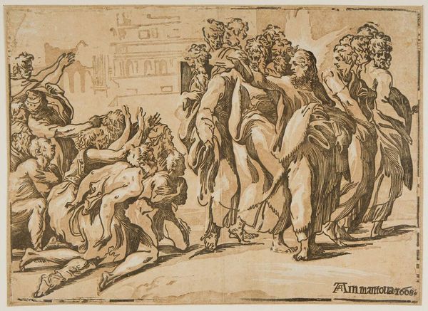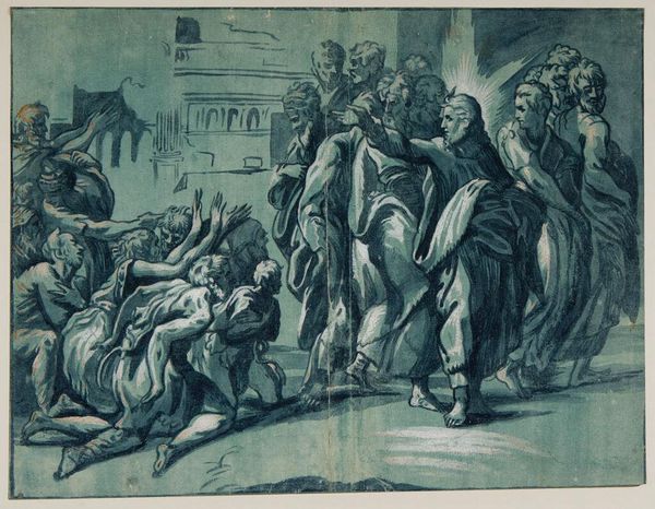 Curator: This is Giuseppe Niccolò Vicentino’s “Christ Healing the Lepers,” housed here at the Harvard Art Museums. Editor: What strikes me immediately is the dynamism, the way the figures surge forward, almost spilling out of the frame. Curator: Indeed, Vicentino masterfully uses chiaroscuro to heighten the emotional intensity. But, beyond the formal aspects, consider the socio-political implications of such imagery. Leprosy, then and now, carries immense social stigma. Editor: Agreed, the stark contrast between light and shadow does emphasize the lepers' suffering. The composition directs our gaze to the healing touch, the almost tactile quality achieved through the lines. Curator: Exactly, and by portraying Christ’s compassion, Vicentino subtly critiques the marginalization of vulnerable populations, advocating for empathy and inclusivity. Editor: An intriguing point; it reframes our understanding of the scene, linking the formal construction to broader social commentary. Curator: Art allows us to find meaning. Editor: Or allows us to create it.
