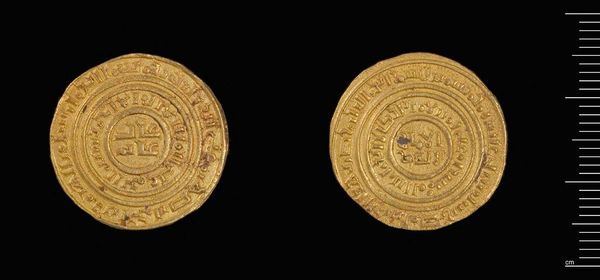 Editor: Here we have the Dinar of al-'Aziz, Misr, a golden coin from an unknown date, its creator being Al-âAziz. The concentric circles surrounding the center remind me of ripples in a pond. What do you see in this piece? Curator: The arrangement of the script in concentric circles evokes not just the idea of ripples, but also of a spiritual unfolding. It’s reminiscent of cosmological diagrams, mandalas, or even the layout of certain cities considered sacred. Do you think that was intentional? Editor: That's fascinating. I hadn't considered those connections. I suppose the repetition could suggest a deeper meaning. Curator: Yes, and the act of minting a coin, imprinting it with symbols and script, transforms it into a carrier of cultural memory, a tangible representation of power and belief circulating within society. Editor: I see it now. It’s more than just currency; it's a potent symbol. Curator: Precisely. Examining symbols reveals more about cultural values than texts alone.