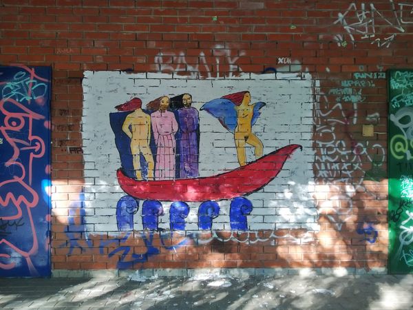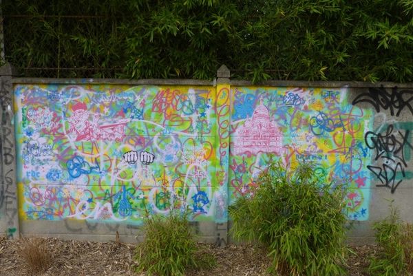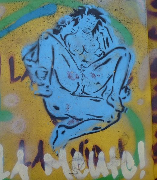 Curator: Sobering, wouldn't you agree? I am looking at a photograph of what appears to be an exterior wall, spray-painted with cats above kneeling figures, by the artist Bahia Shehab; it’s entitled "Rebel cats". Editor: It's intriguing. There's a distinct rawness to it; the wall itself tells a story of wear, and then these brightly colored stenciled cats sit incongruously above, almost mocking, those crouching shapes. Curator: Note how the horizontal disposition of the cats creates a striking pattern. This repetition is reinforced by a stark contrast between their solid blocks of color and the white forms beneath. It gives a formal cadence that's disrupted, significantly, on the right-hand side, doesn't it? The spray application loses integrity there, it dissolves. Editor: Exactly. And this degradation highlights the temporary nature of street art, its inherent connection to the social and political conditions of a place. The layered spray paint shows the act of making art, the artist, materials, the labor behind each one of them. It's all front and center. Curator: The kneeling forms have an unfinished quality; they’re linear, minimal in their delineation. It is precisely in their incompleteness, though, that we are compelled to complete them with our imagination. It echoes the themes of collective protest that the artist works with regularly. Editor: Do we know where this mural was originally located? It seems its meaning relies heavily on its environment. It feels critical of a specific culture of work and the means in which value or status is constructed, perhaps built around a specific exploitation. Curator: The context, of course, would sharpen our understanding of Shehab's deployment of those stencils. There's a disruptive spirit that is visually very dynamic. Editor: This art existing as accessible urban graffiti breaks traditional elitist notions of what belongs inside art institutions versus everyday life. I respect how her visual language disrupts our complacency. Curator: I leave this image thinking about how structure meets social conscience, it is thought-provoking on how to read it from here. Editor: For me, this image challenges the existing conditions around it—from the way it was created, using accessible art materials, all the way to how it exists today.