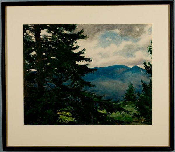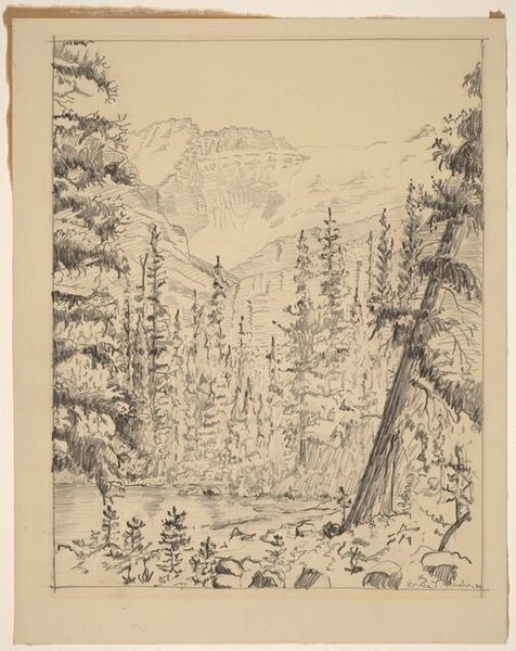 Curator: This is Warren Mack's "Colorado Landscape," a woodcut print, now residing in the Harvard Art Museums collection. Editor: Ah, stark and dramatic. The black and white contrast really emphasizes the ruggedness of the terrain. It feels almost... primal. Curator: Exactly. The artist uses this technique to portray nature as both powerful and serene. The trees, almost like guardians, frame the mountain, a near-universal symbol of resilience and ascent. Editor: You know, the lack of color actually adds to that timeless quality. It's almost as if Mack wants us to see beyond the immediate view, to tap into something enduring. Curator: Perhaps. The dense forest also speaks to the unknown, the path yet to be taken. It’s a landscape ripe with potential narratives. Editor: Indeed. Looking at it now, it feels like more than just a landscape, but a reflection on time itself.