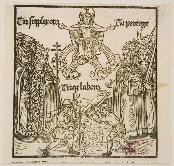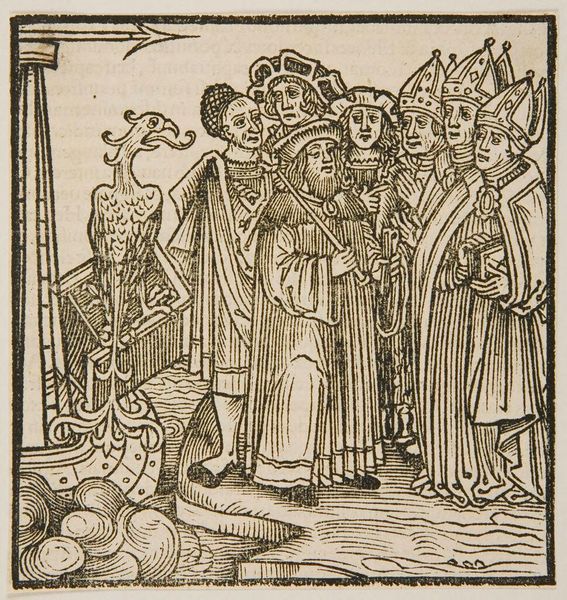 Curator: Here we have Illustration XV, an anonymous work held here at the Harvard Art Museums. Look at that stark contrast! What's your first take? Editor: Austere. It reminds me of tarot cards, but stripped down, almost medieval in its directness. The supplicant offering a book to the crowned figure. Curator: Precisely. The book is a key element. Note the 'X' symbol emblazoned upon it. We see that shape again and again across different cultures. Editor: It’s also a symbol of fate or choice, isn’t it? Like crossing paths, a decision point. Does the king accept the offering, and what path will that set in motion? Curator: Exactly. This is about legacies and decisions. It's a reflection of power, obligation, and possibly sacrifice. Editor: It's a bit unsettling how impassive everyone is. Almost as if they know something we don't. Curator: The artist is showing us a moment pregnant with meaning. The symbol makes it something timeless. Editor: Well, I think I'll stick to novels with less fraught symbolism and clearer moral compasses.