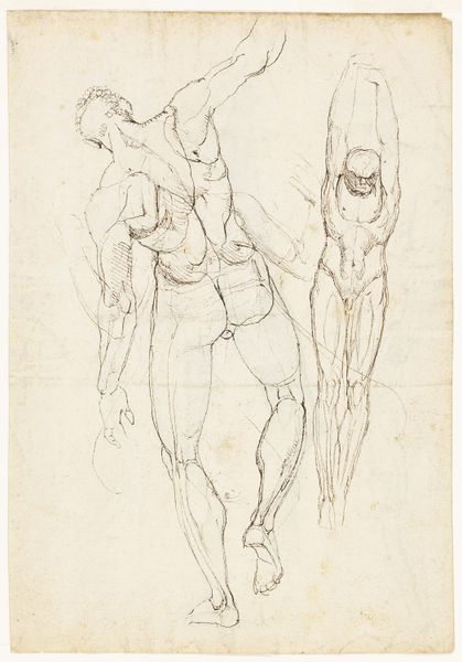 Editor: This drawing, "Two Ecorchés," by John Hamilton Mortimer, shows figures stripped of skin, revealing their muscles. It’s quite striking! What do you see in it? Curator: It’s a window into the artistic process, isn't it? Notice how the artist meticulously renders the musculature. It highlights the labor involved in anatomical study and the material understanding required for such a depiction. Editor: So, it’s not just about the finished product but the process of creating it? Curator: Precisely! And consider the social context: the accessibility of anatomical knowledge, the role of art academies, and the demand for such studies. It reflects a society valuing scientific inquiry and artistic skill, showcasing the relationship between them. Editor: I never thought about it that way. Thanks for pointing that out! Curator: My pleasure! There is always more to discover when we look at the means and context of production.