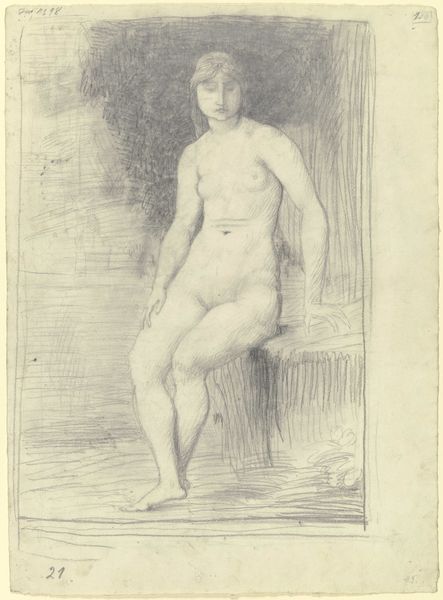 Józef Simmler created this nude study of Queen Bona, a preparatory sketch, with pencil on paper. Notice the sketch's emphasis on line and form; the contour of the Queen’s body and the chair is defined by delicate, almost tentative lines. The hatching technique employed to render shadows and volume gives the figure a three-dimensionality. Consider the historical context: Simmler, working in the 19th century, engages with academic traditions of figure drawing. This nude study exists as a formal exercise and also embodies the complexities of representing power and femininity. The act of sketching a nude, even as a study, challenges the conventional representation of historical figures. The linearity of the sketch is a key element. It's not merely descriptive; it's constructive, using line to explore the boundaries of representation and to question the relationship between form and meaning. This approach invites a continuous process of interpretation, reflecting the evolving discourse around art and representation.