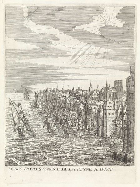 Curator: The intricacy of this engraving, simply titled *Aankomst van Maria de' Medici in Rotterdam* or, *Arrival of Maria de’ Medici in Rotterdam*, from 1639, completely overwhelms me! The detail is just stunning, isn’t it? Editor: It certainly does offer a comprehensive overview, but my immediate sense is one of almost oppressive density. So many rooftops, so many masts—a visual metaphor, perhaps, for the complex political landscape surrounding Maria de' Medici? Curator: Exactly! This piece gives us such a fantastic glimpse into Dutch Golden Age society, shaped by figures like Medici, an important political mover of her time, not just a figurehead. How do you read the imagery surrounding her arrival itself? Editor: Given Medici's tumultuous relationship with France and her eventual exile, the celebratory nature feels laden with irony. The mass of onlookers feels more like a control mechanism when thinking about how women of power were received during that era. Does the cityscape overwhelm the figures deliberately? Are we supposed to feel a sense of unease amidst this seeming triumph? Curator: Precisely the questions we should be asking! Maria de’ Medici constantly dealt with controlling narratives—her power mediated through male advisors and family members. Considering intersectional gender and power dynamics, Rotterdam’s overwhelming presentation diminishes Maria’s importance on several fronts, right? Even nature’s represented in great swathes as great billowing cloud formations Editor: Absolutely. Think about the way landscapes are used—particularly cityscapes. Here, Rotterdam isn't merely a backdrop; it's a player. Anonymous engraver highlights not just Medici's arrival, but Rotterdam's wealth and stature, secured through complex global trade relationships. This work reminds us that art served multiple agendas in the 17th century, bolstering civic pride and conveying a broader political message while ostensibly commemorating an individual. Curator: That is very insightful, by carefully mapping those socio-political relationships within that space. Perhaps, more work in the frame, or indeed out of it! This offers critical reflection that art continues to encourage. Editor: A fittingly layered departure point, considering all we've seen today!
