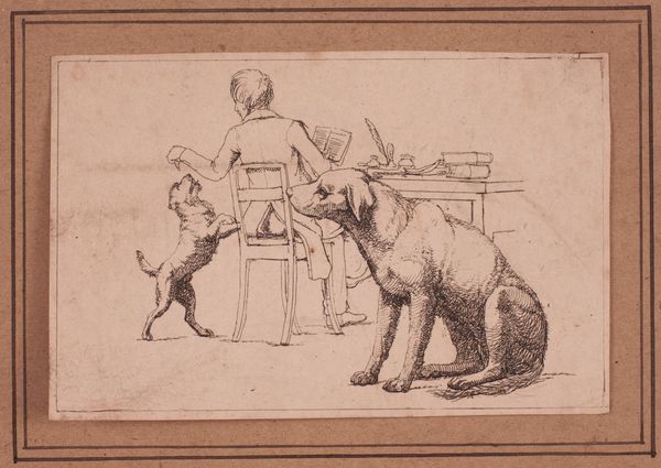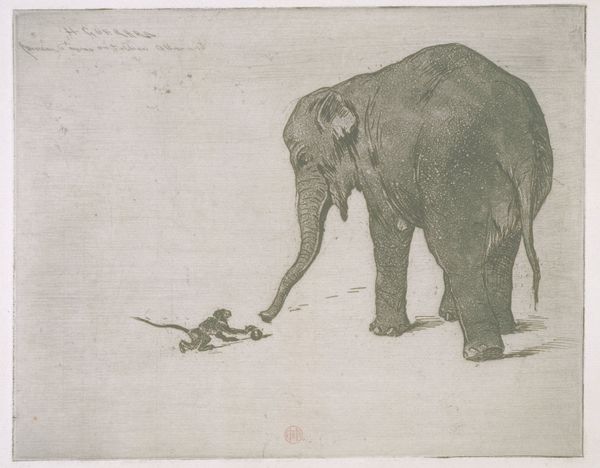Editor: So, this is Rembrandt van Rijn's "An Elephant," created in 1637. It’s a pencil drawing. I’m struck by the textural contrast between the rough hide of the elephant and the almost ethereal quality of the figures beside it. What stands out to you when you look at this drawing? Curator: The brilliance of this work resides in Rembrandt's deft manipulation of line. Notice how varied the lines are; some are bold and assertive, defining the elephant’s bulk, while others are delicate and fleeting, suggesting shadow and form. What effect do you think this variation achieves? Editor: It creates a real sense of volume, and that the elephant is heavy, but also emphasizes its wrinkles and folds? The lighter lines make the people look almost like ghosts. Curator: Precisely. Observe, too, how the composition guides our eye. The elephant is positioned prominently, nearly filling the frame. The figures are smaller and placed further back, which serves to accentuate the elephant's immense scale. How would the piece be altered, do you think, if the people were equally as detailed and in the foreground? Editor: The elephant wouldn’t seem as monumental, I suppose, or perhaps they'd have more interaction, if they weren’t faded away like that. Curator: Indeed. Consider how Rembrandt has utilized line to capture both the physical presence and perhaps even the implied power of the animal. It’s more than just a representation, isn't it? Editor: Yes, it really captures a sense of its mass and even its gentleness, despite its size. I learned a lot about Rembrandt's artistic strategies through the lens of form. Curator: And I have gained a renewed appreciation for the nuances within Rembrandt’s line work.