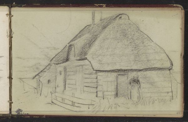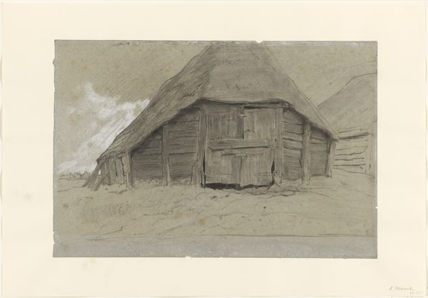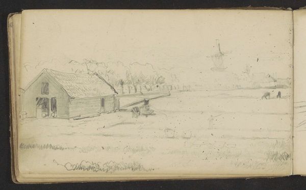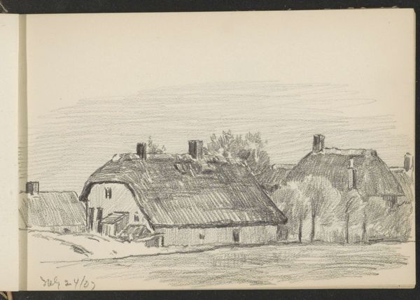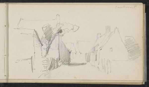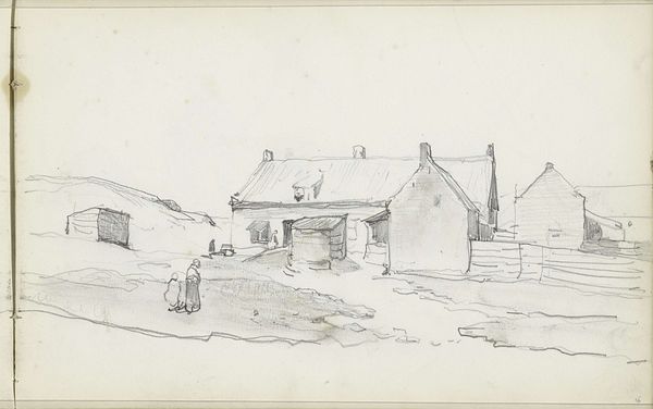 Curator: We’re looking at a pencil drawing today. The Rijksmuseum calls it "Boerderijen aan een landweg, mogelijk in Laren," or "Farms on a Country Road, possibly in Laren." It was made by Albert Neuhuys, sometime between 1854 and 1914. Editor: It has this wistful quality to it, doesn't it? Very soft and subdued. It feels like a memory more than a crisp, defined reality. Sort of like squinting your eyes and trying to recall a place you knew as a child. Curator: Interesting. And look closely; you'll see the means of production so clearly. The sketch is very visibly rendered in pencil on paper. We see the texture of the paper and varying pressure of the artist’s hand to make marks, building up the image. Consider, too, Laren was then developing as an artists’ colony – these ‘rustic’ images actually catered to urban demand. Editor: Right, the city folks longing for the country idyll. I imagine Neuhuys sitting there, maybe a bit windswept, carefully choosing what to include. Those bare trees hint at autumn, the little road winds like a secret. It invites a feeling of quietude. Curator: Absolutely. Think about the choice of pencil too, not paint. A quicker, cheaper, and more readily accessible material. How this speaks to the function of this sketch – perhaps a preliminary study, or simply for personal record and recollection by Neuhuys, rather than immediate presentation. Editor: I see it as almost reverent. Simple materials, humble subject, rendered with what feels like great tenderness. Not flashy, not loud, just quiet observation. What do you suppose Neuhuys felt drawing this, I wonder? It just whispers simple pleasures and the transience of rural life. Curator: It prompts considerations on artistic labor of observation, capturing the subject's fleeting impressions, then carefully choosing details to be rendered or omitted. By studying this piece, we can appreciate both the artistry and the work. Editor: I am left feeling an aching familiarity, as if, once upon a time, I myself took that very road, and it left its mark upon my own memories. Curator: Indeed, that's how the drawing and the labor and conditions under which it came into existence resonate to the core of its presence in museums today.