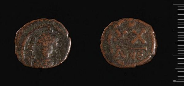 This coin was produced in the Byzantine Empire during the reign of Maurice Tiberius, and seeing it now it feels like holding a piece of history in your hands. The way the image has been worn down over time, the once-sharp lines have softened, and the copper has taken on a beautiful, almost painterly patina. There's a real sense of texture here, and you can almost feel the weight and the smoothness of the metal. I keep looking at that corroded surface, it's kind of incredible how time can transform something so deliberately made into something that feels almost accidental. The incised image of the Emperor is a kind of primitive portrait, yet it bears all the marks of high office; crown, robes, stern gaze. The other side bears the Greek letter 'K', perhaps a monetary value, or a royal cypher, but to me it recalls the work of Cy Twombly, and how he made something profound out of simple graphic gestures. There's something of that here too, in this coin.