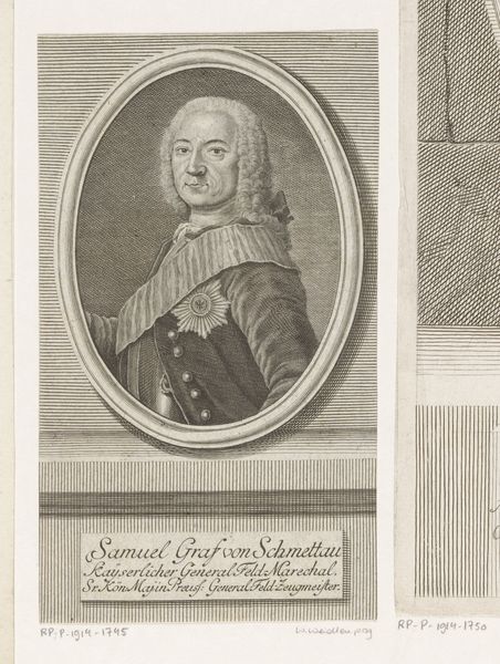 Curator: Here we have Johann Martin Bernigeroth's "Portret van Johann Franz von Kesselstatt," created sometime between 1743 and 1767. It's a fascinating piece on, what appears to be, aged paper. Editor: Oh, immediately strikes me as formal. A serious gent peering out, encircled, almost floating against those severe, regimented lines. A man very conscious of his position, wouldn't you say? It gives off an air of... self-importance, maybe? Curator: Certainly, the composition suggests a deliberate emphasis on status. The oval frame within a rectangular format creates a structured viewing experience. It invites the viewer to focus intently on the subject's face and attire. Editor: Those lines, they hem him in! It's like he's in a very stylish cage. Does this tight framing speak to the restrictions placed on such men? Courtly expectations, societal pressures perhaps? Curator: Possibly, though it could also signify the limits of representation. The artist is presenting a constructed image, not necessarily a literal reflection of the man himself, a tension, of course, found throughout portraiture. Editor: Mmm, maybe. Look at those wig curls, though! Each stroke painstakingly rendered, suggesting artistry yet strangely static. Trapped perfection perhaps? Are we supposed to be impressed or subtly question such display? It’s almost comical in its rigidity, like a satire waiting to burst forth. Curator: The contrast in textures – the soft wig versus the harder lines of the frame, or his formal robes – plays a vital role. Consider, too, the etching technique, its contribution to the work’s graphic qualities... it emphasizes form and line over softer, painterly effects. Editor: Yes, that's true, I think what stays with me, really, is how effectively that starkness conveys a mood that lingers. This isn’t just documentation. Curator: Agreed. The portrait transcends mere representation. Bernigeroth offers a considered visual analysis of power and perception within the context of the time, as viewed through its structural framework. Editor: So, what seems like a simple portrait is really a dialogue—a conversation about duty, artifice, and maybe, just maybe, a hint of the person hidden beneath the finery. Thanks for pointing that out.