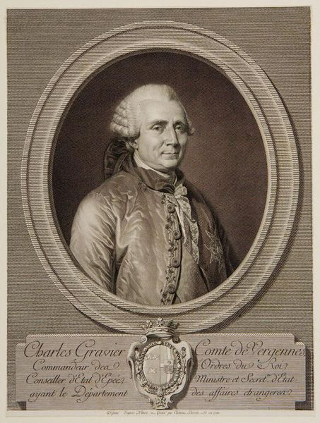 Editor: This is "Joseph II, Emperor of the Romans," by Christian Gottfried Schulze, residing at the Harvard Art Museums. The portrait has a very formal and rigid feel, reinforced by the framing. What strikes you about the composition? Curator: Observe how the oval frame, itself adorned with concentric lines and rosettes, dictates the viewer's focus. The artist utilizes contrasting textures—smooth skin against detailed fabric—to create visual interest within a limited tonal range. The inscription below acts as a grounding element. Editor: So, the artist is emphasizing structure and form to convey a message about the subject's status? Curator: Precisely. The layering of geometric shapes and the meticulous rendering suggest a deliberate construction of power through visual language. Consider how each formal element contributes to the overall effect. Editor: Fascinating. I hadn’t thought about the rosettes as a way to reinforce the frame. Curator: By analyzing visual elements, we gain insight into the artist’s intent and the artwork's inherent qualities.