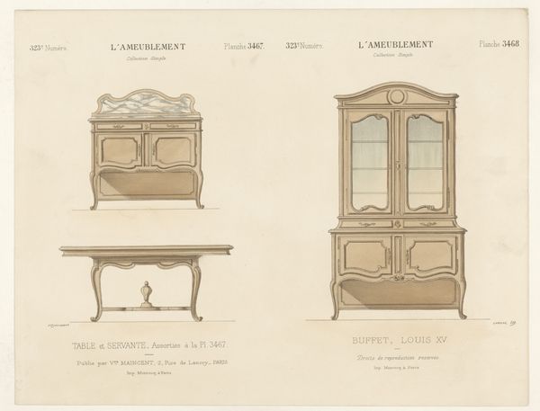 Léon Laroche made this print titled 'Drie boekenkasten', or 'Three Bookcases' which presents various models for bookcases. These designs reflect a moment in time when the domestic space was being re-evaluated, and furniture became a reflection of one's identity and status. The bookcases are not just functional objects, but cultural artifacts. Each design suggests a different kind of owner and perhaps, a different kind of intellectual pursuit. The simple bookcase for the everyman versus the more elaborate for the petit bourgeois. These designs offer us a glimpse into the social values of the time, where access to knowledge and the display of it, were increasingly democratized yet still stratified by class. What does it mean to have access to books, to knowledge, and how does it shape who we are? How do the objects that surround us in our domestic spaces reflect our aspirations?