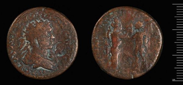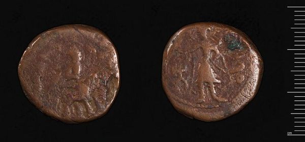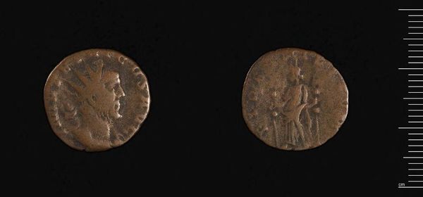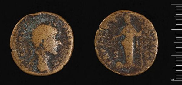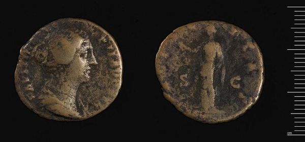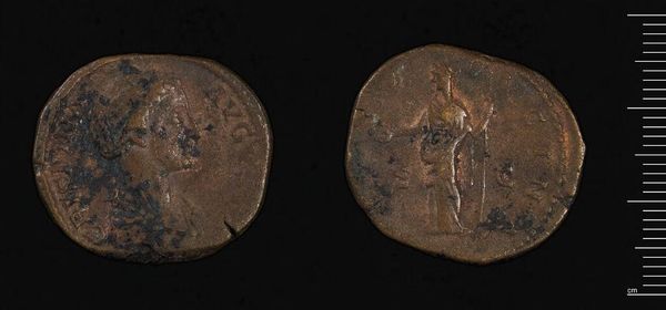 Editor: Here we have a coin depicting Commodus. It's worn smooth with age and handling, but it's still clear he wanted to leave his mark. What symbols do you see at play in this piece? Curator: It's fascinating how a small object can carry so much weight. The portrait itself is a potent symbol of power and authority. Do you notice anything about how he's presented? Think about the traditions of Roman portraiture. Editor: He's in profile, like Caesar... but there's a softness to the lines that makes him feel less imposing, more human. Curator: Exactly! And on the reverse, the standing figure – likely a deity – embodies the promise of prosperity and protection. Coins weren't just currency; they were propaganda, shaping public perception. Editor: So, each element was carefully chosen to project a specific image of Commodus? Curator: Precisely. It reveals how rulers sought to control their legacy through symbolic representation. Editor: I never thought a coin could tell such a layered story!