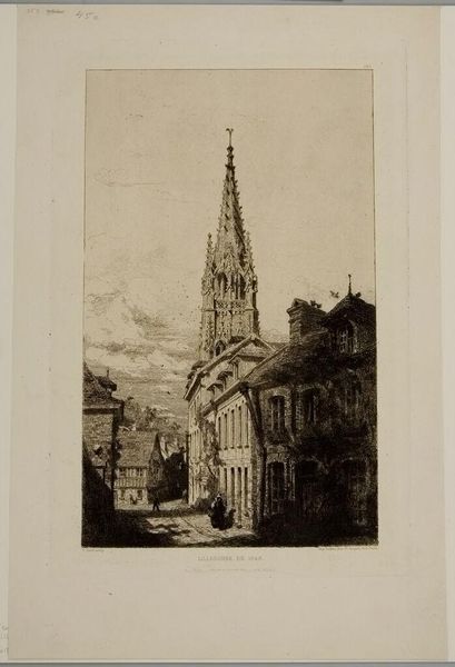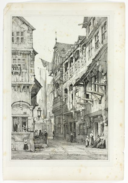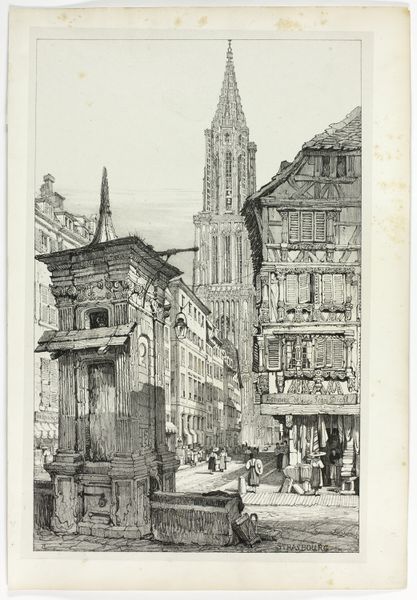 Curator: Samuel Prout's artwork "Strassburg", now at the Harvard Art Museums, captures a bustling street scene. The architectural detail is striking, isn't it? Editor: Yes, immediately the eye is drawn to the towering cathedral spire in the background, a symbol of enduring faith amidst the everyday chaos. Curator: Prout was known for depicting European cityscapes, and this piece reflects the period's fascination with the picturesque. Notice the figures; their roles are almost performative. Editor: The presence of market carts, and the figures engaged in commerce, does reinforce a sense of daily ritual, reflecting the pulse of the city. Curator: Precisely. The image reminds us that even grand architecture exists within the flow of mundane civic life. Editor: The spire remains, a testament to the enduring power of symbolic structures within cultural memory. Curator: It certainly provides a powerful contrast to the temporary nature of street life. Editor: A contrast that helps us appreciate both the mundane and the monumental.