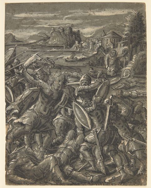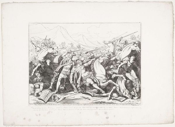 Curator: Editor: Here we have "The Battle Near Hulst, from Der Weisskunig," a woodcut print by Hans Burgkmair, dating roughly between 1775 and 1800. The scene is so chaotic, a jumble of bodies and weapons! What’s your take on this work? Curator: As a woodcut, its very existence points to a process. Notice how the labor involved in carving the block dictated the forms – that decisive black line defining everything. This was reproducible art, tied to distribution and, arguably, shaping perceptions of conflict itself. Editor: So, you’re saying the medium isn’t just a delivery system; it affects the message? The roughness of the woodcut, it’s mass producible format, make it something different? Curator: Precisely. Consider the material context. Woodcuts were relatively cheap and readily available, so its purpose goes hand-in-hand with how the battles of that era were distributed to a wide public, how the image was consumed. Was it used for political purposes? Propaganda, perhaps? Editor: Hmm, I hadn't thought about it that way. It is interesting to notice the material process being inextricably tied to the representation of the battles and how its narrative reached a broader public audience. Curator: Exactly. How does the relatively 'low' status of printmaking influence our perception of history painting? Does it democratize history or dilute it? Editor: I see what you mean. By thinking about its material production, you suddenly reveal the role it plays as cultural object! It really changes the perspective, it goes far beyond depicting conflict on a static page! Curator: Indeed! Paying attention to material means considering power, accessibility, and the very construction of our historical understanding.