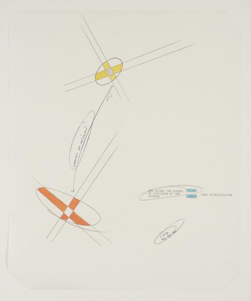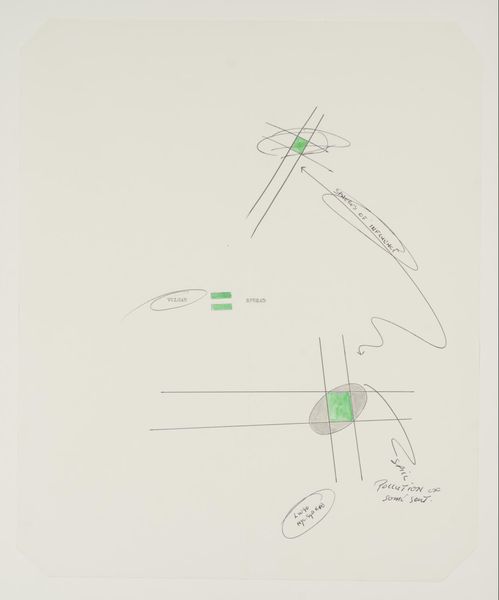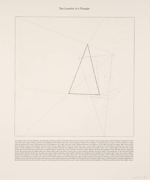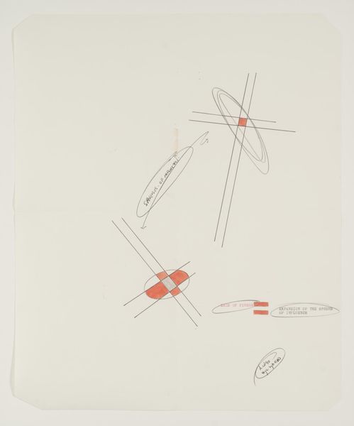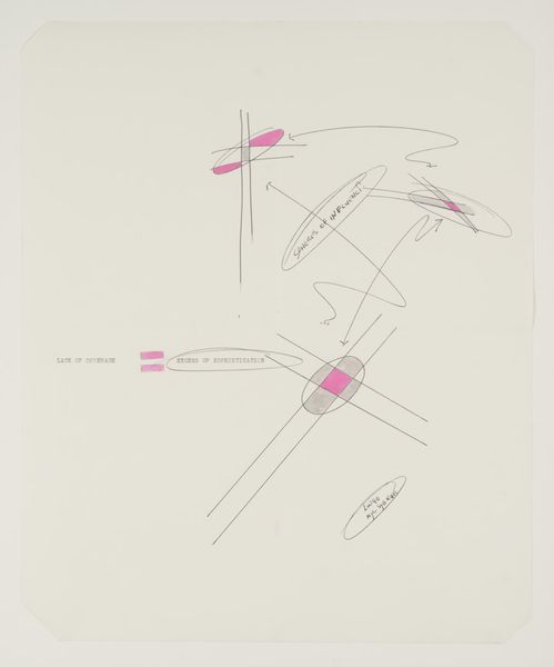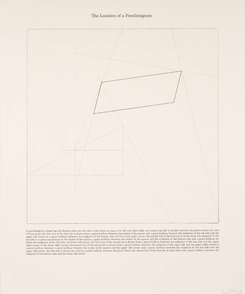 Curator: Lawrence Weiner’s work, "SPHERES OF INFLUENCE," presents a deceptively simple composition. What are your initial thoughts on it? Editor: Stark, almost clinical. The use of language as image raises questions about power dynamics and how we perceive influence. Curator: Weiner, who passed away in 2021, often used language itself as the medium. Here, the dimensions are 435 by 422 mm. How does the scale and the use of text contribute to its impact? Editor: The small scale forces a degree of intimacy, yet the language feels detached. It’s a push and pull between connection and intellectual distance, making you think about the unseen forces shaping our world. Curator: It's interesting to consider how Weiner’s work challenges the conventional notion of the artist’s hand and the art object itself. Editor: Precisely. It's a conceptual piece inviting critical engagement with the viewer's social awareness, which is crucial when we are looking at conceptual work like this. Curator: A piece that continues to offer fresh perspectives, even after multiple encounters. Editor: Indeed, it highlights the subtle yet pervasive ways influence operates in our society and within us.
