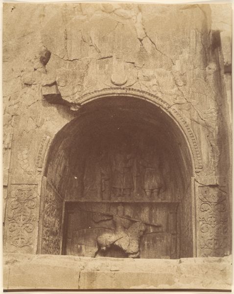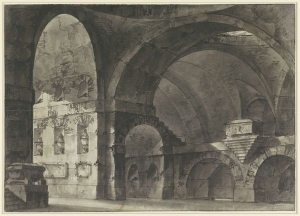 Curator: This is "Architectural Subject" by Louis-Joseph Isnard Desjardins, a lovely sepia drawing. Editor: My first thought? It's like a stage set, this crumbling grandeur, with figures perched in the foreground. Curator: Exactly! Desjardins had this knack for turning ruins into intimate theaters. Notice the people; their presence disrupts the severity of the architecture. Editor: And who gets to occupy these ruins? Are they simply resting, or are they refugees, perhaps? Curator: It's interesting you should say that. These spaces become sites of resistance as much as they are spaces of retreat. Editor: It makes you wonder about the stories these stones could tell, doesn't it? All the lives sheltered, battles witnessed... Curator: Absolutely, the drawing itself becomes a silent witness, inviting us into its sepia-toned world. Editor: A potent reminder that even in decay, there's always space for life, for shelter, for quiet dissent.
