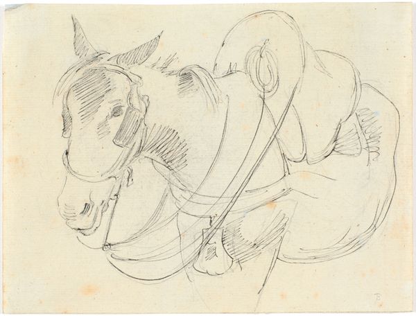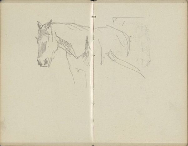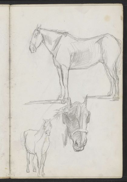 Editor: George Hendrik Breitner’s "Drie paardenhoofden," created in 1872, is a striking pencil drawing. I'm particularly drawn to the artist's delicate rendering of the horse's features, even in what appears to be a sketch. What can you tell me about this work? Curator: It's fascinating to consider Breitner's approach. The visible pencil strokes, the paper itself, these are not just neutral supports, but active components. Look at how the varying pressure on the pencil creates depth. It demonstrates the labor involved in the process and his deliberate manipulation of humble materials to create the illusion of form. The repeated study of the same subject-- the horse head - indicates the importance of these animals as instruments of labor in 19th-century society. Do you think that resonates in his decision to focus on them? Editor: I suppose I hadn't considered it that way, but the sheer repetition does speak to a certain...laboriousness. It's not just an idealized image of a horse. Curator: Exactly. The artwork is not so much about the *idea* of the horse, or its symbolic value, but about its material existence within the social landscape. Breitner forces us to recognize the relationship between the means of artistic production—the pencil, the paper, his labor—and the wider context of horses as working animals within a society dependent on them. Does that reframe the piece for you? Editor: Definitely! It’s made me think about how even a simple drawing can reveal complex relationships between materials, labor, and the world around us. I really appreciate the insight! Curator: My pleasure. Reflecting on the tangible aspects and their societal connections adds layers of meaning to this seemingly straightforward sketch.