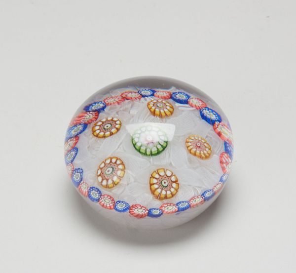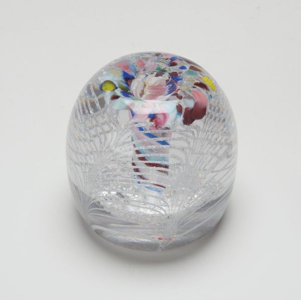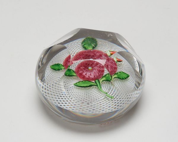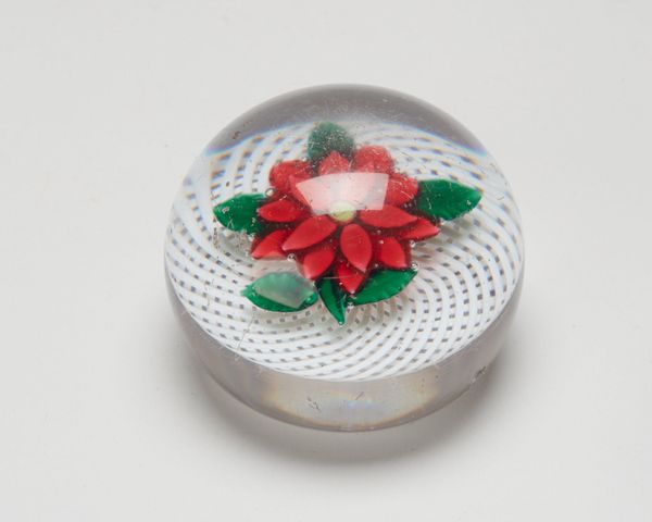 This glass paperweight was made by the Boston and Sandwich Glass Company, which operated in Massachusetts between 1825 and 1888. These small objects capture a moment in the history of industrial production and the rise of consumer culture in the United States. During the 19th century, American glass companies sought to compete with European manufacturers by developing innovative techniques for mass production. Paperweights like this one became popular as decorative objects for middle-class homes, signs of taste and refinement. The delicate floral design encased in glass reflects an interest in nature and beauty, but it was also a product of factory labor and mechanization. To understand its cultural significance, we might consult trade catalogs, company records, and social histories of the period. This can help us reveal the complex relationship between art, industry, and social life in 19th-century America.