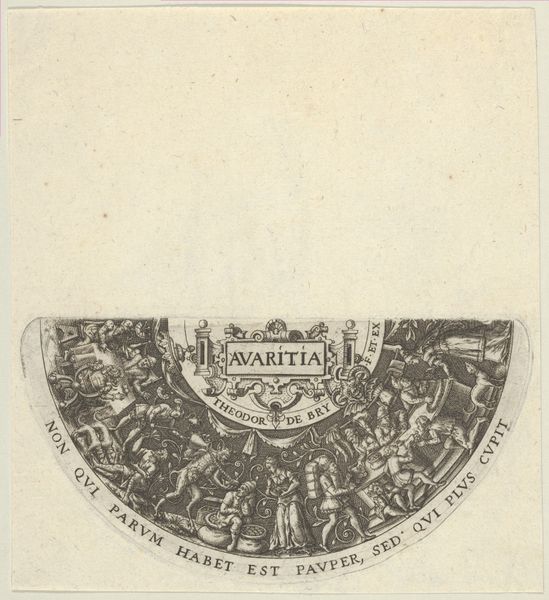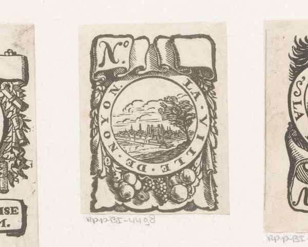 Curator: This small, circular print is titled "Vignet met landschap met een kasteel," attributed to Isaac Vincentsz. van der Vinne, and was likely made between 1681 and 1740. It's an engraving, so we're looking at ink on paper, the lines crisp and deliberate. Editor: It feels almost like a miniature world contained within a coin. There's a strange peace about it, despite the crumbling stone and the faint, almost dreamlike quality to the rendering. Like a memory trying to solidify. Curator: That impression of a self-contained world is apt, given its probable use. These vignettes were often incorporated into books or documents, acting as decorative elements, sometimes even as printer's marks. The production of such detailed engravings involved highly skilled labor, the transfer of drawings onto metal plates, acid etching… all reflecting the era's sophisticated print culture. Editor: I'm drawn to the texture—the stark contrast of light and shadow, achieved through a myriad of fine lines. There's an illusion of depth despite the diminutive scale. But that inscription ringing the scene... it seems to cast a slightly melancholy light on the idyllic castle. Curator: Absolutely. The text translates to something like: "I expect heavenly things, this earthly house having been destroyed." It’s intriguing to consider the context of production – were these motifs made during periods of intense rebuilding of cities as markers of urban aspiration, emblems for new books that envisioned grander architecture or new theologies. Editor: So the charming exterior belies a message about impermanence. It speaks to a yearning for something beyond the tangible, even as it meticulously depicts earthly details—the bridge, the smoking chimney, the castle's battlements. Quite a potent juxtaposition! Curator: Indeed. And that tension encapsulates much of the art of the Dutch Golden Age, a period defined by both incredible material wealth and a deep engagement with mortality. The engraving offers a lens through which we can interpret socio-religious anxieties within Dutch mercantile societies during a very turbulent period. Editor: Looking at it this way, the little vignette becomes more than a quaint scene. It's a memento mori, whispering a warning amidst the beauty. Quite a lesson contained in such a small package. Curator: Yes, considering the processes, skills and broader conditions, we realize even the smallest artefact may hold a weighty history within it.