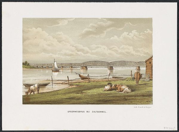 Editor: Here we have "Moerdijkbrug," made between 1872 and 1874. It's an aquatint print currently held in the Rijksmuseum collection. I find the bridge really dominates the scene, even though there are these cute sailboats and buildings. What do you make of it? Curator: It's crucial to consider the material conditions that birthed this image. The aquatint technique itself is interesting; the use of acid to create tonal variations, simulating a watercolor effect, suggests an ambition to elevate printmaking. The artist's manipulation of copperplate production allows this piece to be serially reproduced, widening consumption. Think of it within its contemporary media landscape; do you see the bridge and setting in relation to other images of technology, of labour, or progress? Editor: I suppose, it's a celebration of engineering perhaps? But there's a sense of nostalgia, too, with the sailboats and muted colours. How does that play in? Curator: Exactly, it's a very conscious play. The very image itself documents both progress and the existing context which progress emerges from. I imagine the materiality of its context would determine its perception by contemporary viewers and consumers of the day, who both rely on that bridge to some degree as well as have potential economic investments. How can we examine who commissioned such an image to both sell and perpetuate? Editor: That’s fascinating. Thinking about the bridge not just as an object, but as something made, consumed, and deeply connected to the economy around it gives me a totally different perspective. I learned to consider the art production and also how it fits within the big social context. Curator: Precisely! It prompts us to reconsider these materials and tools and the bridge in their historical settings. I look at prints not only as aesthetic objects, but also a reflection of a historical environment.