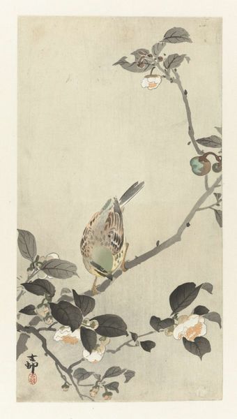 Ohara Koson made this print of a songbird on a plum blossom using woodblock printing. In this process, the artist first carves the image into a block of wood, leaving a raised surface for the areas to be printed. Ink is then applied to the block, and paper pressed against it to transfer the design. The striking lines and clear separation of colors are characteristic of this meticulous method. Woodblock printing isn't just a mechanical reproduction; it's a craft that requires the artist to be deeply engaged with the material properties of wood, ink, and paper. Koson’s mastery over this process has resulted in a work that beautifully captures the texture and form of nature. The production of ukiyo-e prints like this one involved a division of labor, with specialized artisans handling carving, printing, and publishing. By considering the labor involved in producing this work, we can better understand the rich social context in which Koson was working, and move beyond a simple appreciation of the image.