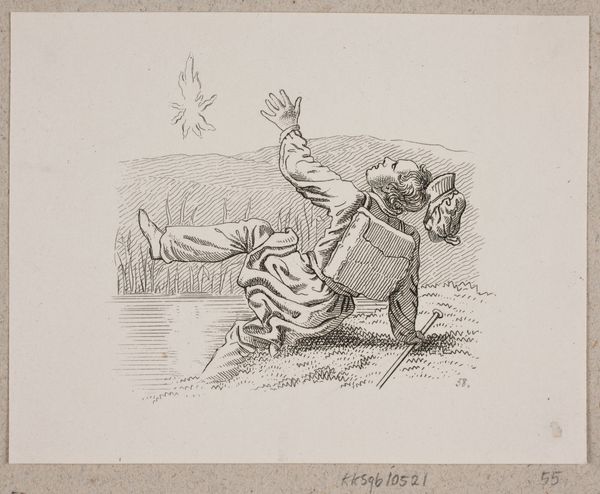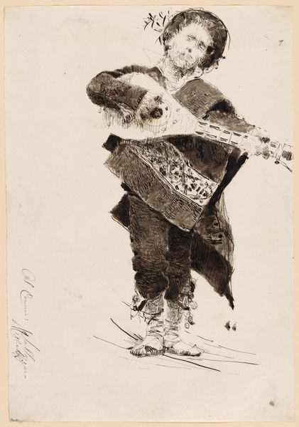 Editor: This drawing, “Jongen springt op de rug van een man,” or "Boy Jumps on the Back of a Man," by Hans Borrebach, created before 1945, is rendered with pen. The style is very cartoonish. I'm struck by its seeming spontaneity. What is your read on this? Curator: Considering the era, it speaks volumes about artistic production during times of social upheaval. Pen and ink, readily available, were democratized mediums, weren't they? This simple drawing potentially democratizes image creation. It would've been infinitely reproducible. Do you think it conveys some commentary on social dynamics or, dare I say, even play? Editor: That's interesting! It could definitely be a critique, masked as playful illustration, of social hierarchies, maybe hinting at shifting power dynamics or commenting on labor and leisure within families or a community. Curator: Exactly. And what about the artist's choice to employ caricature? It's not mere decoration, is it? Caricature is always about revealing and judging. Think about what Borrebach, in the process of mark-making, considered. The weight of the ink, the gesture of his hand, the paper used, even the availability of materials speaks volumes, right? The 'how' is just as important as the 'what', because the 'how' shapes the 'what'! Editor: Right. Now I'm looking at it through the lens of production... This was not only an image made, but also an object constructed with readily available materials. I see it much differently. Curator: Precisely! And that contextualization illuminates both the piece and its moment in time, challenging us to reconsider established narratives surrounding "high art."