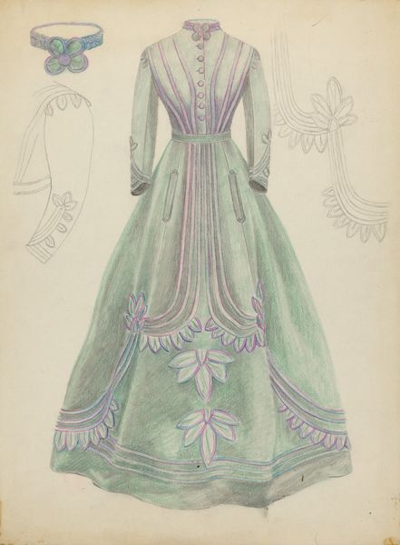 Editor: So, this is Mary E. Humes's "Infant's Dress," a pencil drawing from around 1936. It's quite delicate, isn't it? The details of the embroidery are so precise. What strikes me most is how much care went into documenting something as ephemeral as a child’s garment. What do you make of it? Curator: Well, placing this drawing within its historical context really opens it up. Think about 1936 - the Great Depression is still ongoing. A meticulously rendered drawing of such an ornate garment raises questions about value, labor, and social class. Who was this dress for, and why document it with such care during a time of widespread economic hardship? Editor: That's a fascinating point. I hadn't considered the socio-economic implications. Does this perhaps reflect a nostalgia for a more prosperous past, or maybe even an aspiration for a future of greater comfort? Curator: It could be both. Dress, particularly in this era, was heavily coded with meaning. Garments signaled social status, economic well-being, and adherence to specific gender roles. Was Humes making a fashion statement, or maybe providing a visual archive for future generations? The question of her intended audience feels important here. Editor: So, it's less about the dress itself and more about what the dress represents in the context of its time? Curator: Exactly. Consider how museums today present fashion; it's always within a carefully constructed narrative. Humes, in a way, is curating this garment through her drawing, placing it within a specific frame of reference. Editor: This makes me think about how even seemingly simple images can be packed with layers of social commentary! I never would have thought a drawing of a dress could speak volumes about social history. Curator: Precisely. It's about learning to "read" images and understanding their relationship to the world around them. It certainly makes me appreciate it more, thinking of the labor, class, and aspiration this delicate drawing carries.