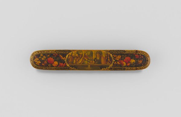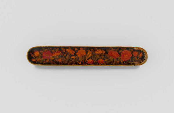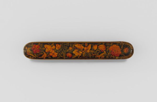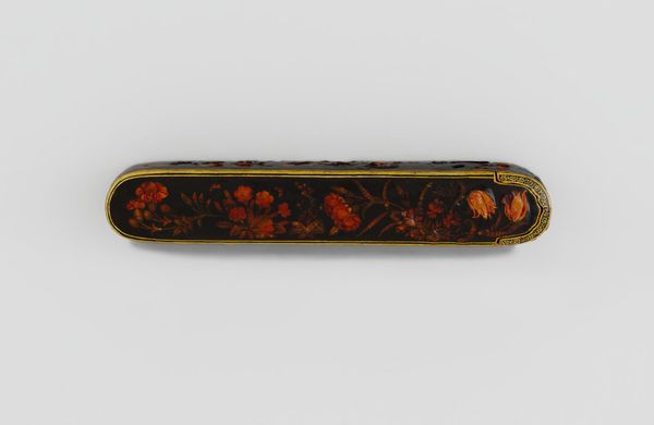 Curator: This is a pen box, adorned with flowers, birds, and butterflies, crafted by Muhammad Husayn Shirazi. Editor: Immediately, I'm struck by its vibrancy. The flowers seem to leap off the dark background, teeming with life and symbolic promise. Curator: Indeed, the choice of lacquer is key here. The high gloss finish not only protects the artwork, but also serves as an ideal base for the intricate painted details. The production required multiple layers and a skilled artisan. Editor: The imagery of birds amidst blossoms carries profound cultural weight. Birds often represent the soul's journey, while the flowers, depending on the type, can signify love, renewal, or paradise. Curator: Precisely. Consider also the function of the piece itself. A pen box speaks to literacy, knowledge, and social status, suggesting a patron with access to education and resources. Editor: It's a beautiful example of how art objects function as carriers of cultural memory and aspiration. Curator: I concur. The confluence of craft, labor, and artistry makes this piece particularly compelling. Editor: A delightful convergence of form and meaning.