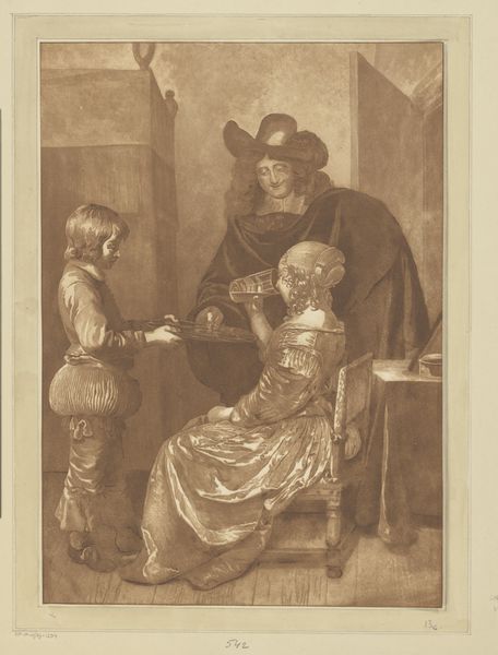 This is an etching by Georg Leopold Hertel, titled 'Richly Dressed Man with Glass in Hand and Woman on His Lap.' At its heart, the image presents a tableau of revelry, dominated by the man’s raised glass, a symbol of celebration and perhaps excess. This motif echoes through art history, recurring in bacchanalian scenes from antiquity to the Dutch Golden Age. Yet, consider the glass itself—a vessel, much like the human psyche, capable of being filled, emptied, and refilled. The gesture of raising a glass transcends mere toasting, embodying hope, memory, and the ephemeral nature of joy. This act taps into our collective memory, resonating with the universal human desire for connection and shared experience. The inherent tension, the cyclical progression of the symbol, underscores its capacity to resurface, evolve, and acquire new meanings, shaping the way we perceive and interact with images across time.