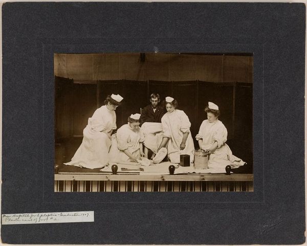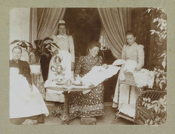 Kassian Céphas captured "Four Young Men Drinking Coffee or Tea" with albumen silver print. The sepia tones and the meticulous arrangement of the subjects create a tableau vivant that invites contemplation. The composition is structured around a horizontal plane where the young men gather. The lines of the wooden backdrop create a subtle vertical counterpoint. The contrast of light and shadow emphasizes the textures of the clothing and skin, adding depth to the otherwise muted palette. The act of sharing a drink becomes a semiotic symbol. The positioning of the book hints at a moment of shared learning or storytelling, suggesting themes of intellectual exchange and cultural transmission. The photograph's formal qualities extend beyond mere representation. The image invites us to consider how the artist frames and constructs cultural narratives, and how these constructions reflect and shape our understanding of identity and community.