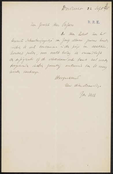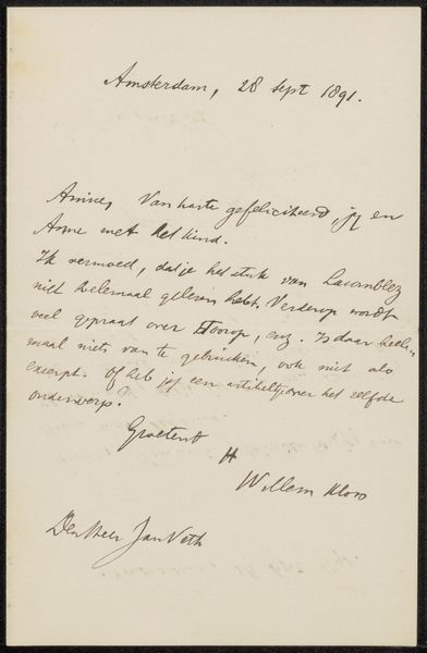This is a letter to Adriaan van der Willigen by Sophie de Koningh, created around 1825. The dominant visual experience is one of scripted text across the page, the flow of the ink marks creating a texture. It evokes an emotional response linked to language, communication, and the personal touch of handwriting. The script reflects the formal writing practices of its time. Here, the arrangement of the text, the careful spacing, and the elegant script become a semiotic system. The act of writing, especially in this formal style, challenges the casual, everyday communication, and establishes a power dynamic where the writer asserts authority through structured language. The visual elements of the letter, from the choice of script to the arrangement of text, function within a broader cultural discourse. The overall composition suggests a highly controlled and deliberate act of communication, functioning not just aesthetically but also as part of a larger social discourse on civility, education, and social hierarchy.