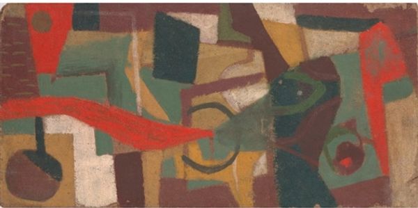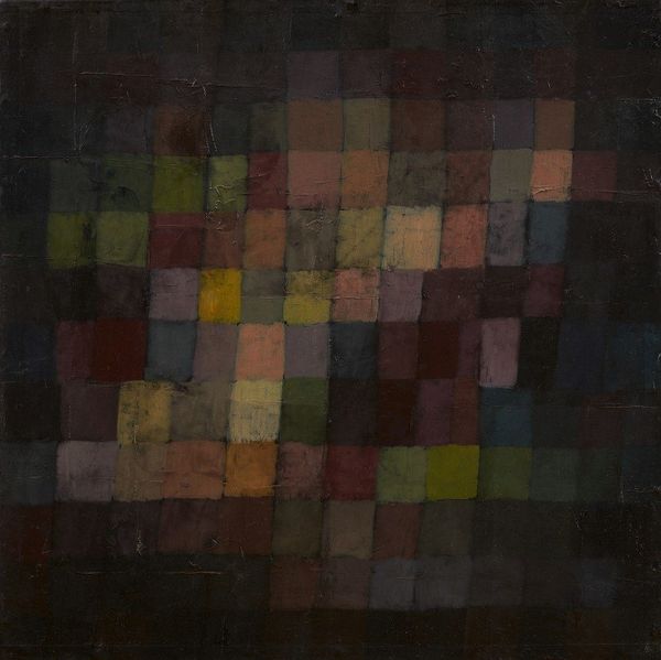 Curator: Right now, we are standing in front of Paul Klee's "Red, Green Architecture", crafted in 1922 using acrylic paint. It is currently part of this collection here at the museum. Editor: Wow, it’s kind of melancholic, isn’t it? Like a dreamscape made of worn velvet. I get a definite autumnal feeling—or maybe a decaying city, something…abandoned? Curator: It evokes the Bauhaus period. Klee's visual vocabulary blends geometric abstraction with cityscapes, forming a sort of constructed reality through colors. It's a commentary on architectural form via emotive symbolization. What is this telling us? Editor: Interesting. All I can think about are pixelated computer games from the 80s. But with better colours! So there's this sort of underlying order here. But I also see these imperfectly aligned blocks - they imply decay but with an understated rhythm of shapes. You know? There is like this haunting visual narrative in here! Curator: It is! The geometric shapes are suggestive, yes? Arches, towers. How architecture provides both refuge and restraint in human society. Red represents passion and disruption; Green for life and regeneration, thus showcasing his duality. Editor: Yes, like a memory of a city. The interplay of shadows and the flat blocks. You can get lost imagining stories. And somehow the colors... muted, yet there's still some kind of hope hiding in it! Curator: You've captured it wonderfully, actually! Klee masterfully distills the experience of urban life into a potent abstract language of the urban life experience in its most refined elements of visual presentation. Editor: It's a great journey. Curator: Absolutely. It pulls together form, feeling and thought...all into a neat square.