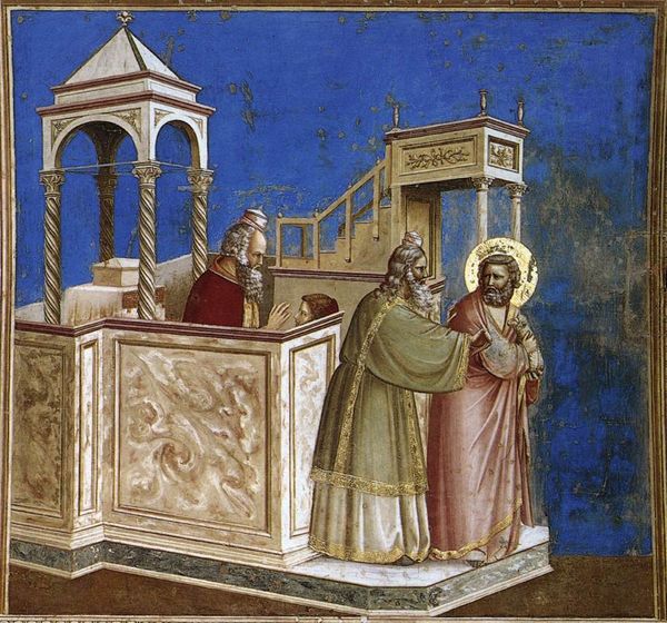 Curator: Oh, look at that tender exchange. There's something about the way those figures are rendered, all draped and weighty, that feels so profoundly human. Editor: You’re responding, I imagine, to Giotto’s "Presentation of Christ at the Temple," a fresco painted around 1306 as part of his cycle in the Scrovegni Chapel in Padua. A crucial work from the early Italian Renaissance. Curator: Fresco! The colors sing even after all these centuries. And those blues... they just lift my spirits, don't they? Although, perhaps that sky has deteriorated a bit? Still, it lends the scene a quiet melancholy, like a hymn sung in a minor key. Editor: The chapel, and indeed this fresco, were commissioned by Enrico Scrovegni, a wealthy Paduan banker, possibly as an act of atonement for his family’s usurious activities. This is very much about public display, both devotional and self-promotional. It sets the stage, quite literally, for a new era in how art could serve individual agendas and reflect emergent cultural values. Curator: I always find something heartbreakingly pure in these depictions of religious stories. Especially when Giotto renders everyone as, well, actual people. Look at Saint Joseph, holding the turtle doves for sacrifice. There's a weariness etched into his face. It pulls me in, that subtle realism amidst the holy. Editor: What I see here is the tension between tradition and innovation. Giotto grounds his figures in physical reality, as you say. And note the architectural elements, the use of perspective. But the function remains rooted in its time; religious didacticism, delivered within the strictures of social power and influence. The story's primary purpose was to edify viewers and to legitimize Enrico Scrovegni's social position by showcasing both piety and artistic patronage. Curator: Right. It’s about the earthly and ethereal interwoven, and he did it so gorgeously. It gives me such an uncanny feeling, even after so many centuries. Thank you Giotto and, I must say, you as well. Editor: Thank you! It's the complexity, really. How this work served not only as a symbol of faith but also as a shrewd assertion of earthly power that continues to fascinate me.