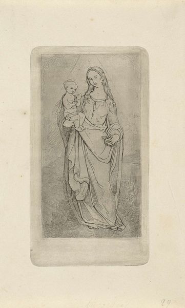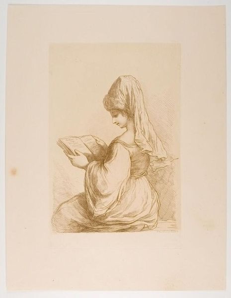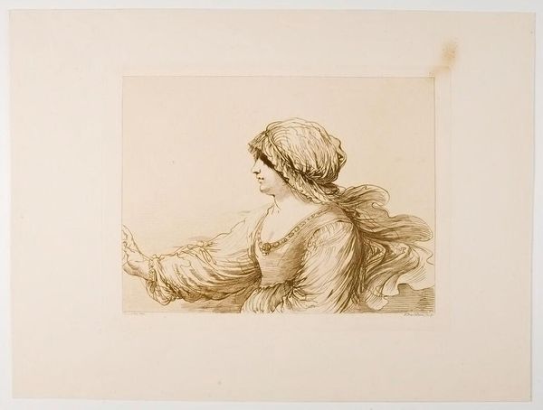 Curator: This is Giuseppe Zocchi’s "Woman with a Rosary," likely created sometime in the mid-18th century. Editor: The sepia tones give it a feeling of quiet introspection, almost like a memory fading into the past. Curator: Zocchi uses the rosary as a potent symbol, layering cultural associations of piety, but perhaps also of social constraint. Editor: It’s interesting to consider how women's lives were often confined to domestic and religious spheres, offering limited avenues for agency. Curator: The way she's depicted in profile, almost anonymous, speaks to the societal expectations placed upon women, obscuring individuality. Editor: Right, and while religious devotion could be a source of personal strength, it also functioned as a tool for regulating women's behavior. Curator: The rosary acts as both a comfort and a chain, echoing enduring themes within Italian culture. Editor: This drawing makes me think about the unspoken narratives of women throughout history, inviting us to imagine their inner lives.