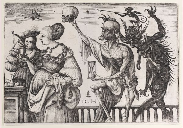 Allaert Claesz. created this print, "Couple and Death with a Drum," part of "The Dance of Death" series, around the mid-16th century. The composition immediately strikes us with its stark contrast: a lively couple confronted by the grim figure of Death. Claesz masterfully uses line work to create texture and depth. The detailed etching emphasizes the macabre dance, a cultural trope reflecting on mortality and the ephemeral nature of earthly pleasures. Note how the skeletal figure, with its crude yet effective lines, juxtaposes against the intricate clothing of the couple, suggesting an underlying structure where social status is rendered meaningless in the face of death. The series engages with existential themes prevalent during the Renaissance. The artist uses a semiotic system where symbols—the drum, the embracing couple, the lion and the skeleton—converge to destabilize notions of permanence, inviting viewers to reflect on life's transience and the inevitability of death. Through its stark imagery and structural contrasts, the work underscores the complex interplay between life and death.