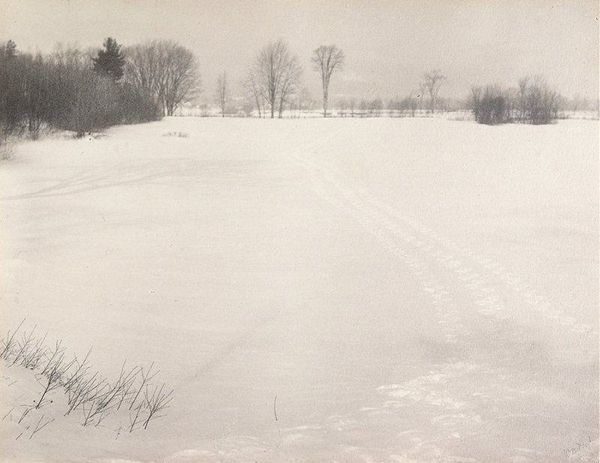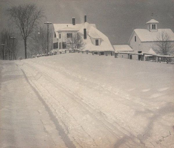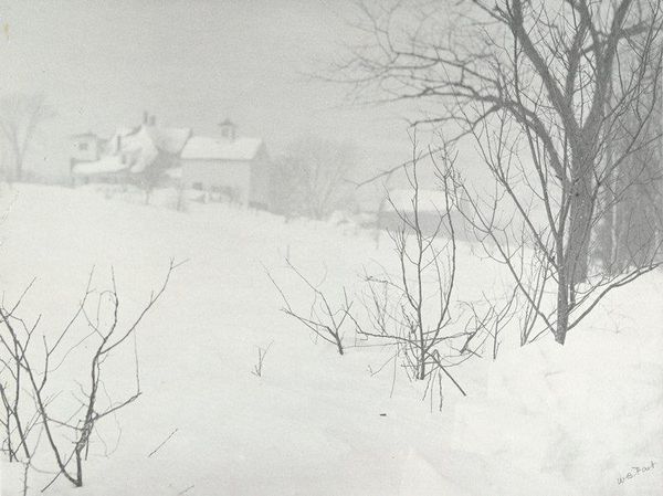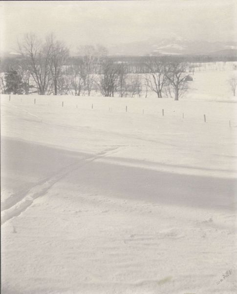 Editor: We're looking at "Intervale," a photogravure by William B. Post, created in 1901. It’s mostly monochrome, and my immediate feeling is of vast stillness. It's quite empty; mostly a snow-covered field. What do you see in this piece, considered through a historical lens? Curator: I see this as a commentary on the rapidly changing American landscape at the turn of the century. Pictorialism, the style Post worked in, often romanticized rural scenes, offering an escape from industrialization and urban growth. Editor: So, this isn’t just a pretty picture of snow; it’s a statement? Curator: Precisely. The vastness you mentioned, that emptiness, can be read as both beautiful and isolating. Consider the social context: urbanization was drawing people away from rural life. Images like this perpetuated an idealized version of it, a carefully constructed myth that often obscured the realities of agrarian life. Notice the small footprints in the snow. Who do you imagine made them and why might this detail be important? Editor: Maybe it emphasizes how even this "untouched" landscape is, in fact, touched by humans? And potentially owned? It disrupts that myth you mentioned of a truly 'empty' or 'free' place? Curator: Exactly. Pictorialism was heavily mediated, participating in—and shaping—cultural narratives. Its reception also depended on institutional support through exhibitions and publications. We should consider how photography was being validated as fine art in institutions at this time. Editor: So even the style itself is part of this larger conversation about art and culture in a changing society? It is an intentional promotion, with political roots and artistic impact! Curator: Indeed. Analyzing art as a part of social history helps to see such works as less about nature and more about culture. Editor: That gives me a lot to consider about photography's role back then. I won't look at Pictorialism the same way!