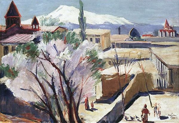 Tetyana Yablonska painted this Armenian village with oil on canvas, capturing a timeless scene. The village nestles beneath a mountain, its houses and haystacks rendered in soft, muted tones. The mountain looms in the background, a silent sentinel watching over the community. The color palette is particularly striking, as each object seems to have a life of its own. These colors are not merely descriptive but are charged with emotional and psychological significance. The yellow of the haystacks, for instance, recurs throughout art history, from Van Gogh’s fields to ancient Egyptian depictions of grain, as a symbol of abundance and the cyclical nature of life. The bold choice of the color red for the figure walking across a rooftop, is an immediate focal point, embodying vitality and life. Consider how such vibrant colors tap into our collective memory, evoking deep, subconscious responses, reminding us of the ever-repeating motifs of life, survival, and the enduring human spirit across cultures.