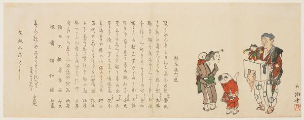 Here we see ‘Street Musicians’, an ink and colour woodblock print by Noritei Kôshi. It offers a glimpse into the Edo period in Japan, a time marked by economic growth, strict social order, and flourishing arts. This print illustrates the lives of marginalized street performers. Often these artists operated outside the strict social hierarchies of the time, making their living through music and performance. These figures challenge conventional gender roles, especially when women took to the streets to perform, subverting expectations of female domesticity. The print captures the itinerant nature of these performers. With their faces obscured by hats, they become symbols of anonymity and resilience in a society that often overlooked them. The inclusion of text, likely poetry or song lyrics, adds another layer, hinting at the stories and emotions conveyed through their performances. 'Street Musicians' offers a poignant reflection on identity, survival, and the power of art to transcend social barriers.
