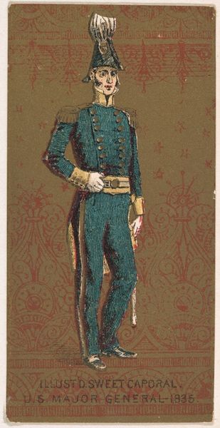Curator: This watercolor print from 1888, entitled "Lieutenant, Light Artillery, United States Army, 1812," was part of a series issued by the Kinney Tobacco Company to promote Sweet Caporal Cigarettes. What strikes you first about this small piece? Editor: The texture! I mean, the surface appears surprisingly smooth despite its origins in a tobacco advertisement. I’m curious about the printing process, given its mass-produced function versus what appears like delicate watercolor. Curator: Right, consider its function. The military uniform itself is a powerful symbol of authority and nationhood, standardized and laden with cultural meaning. Notice the details – the meticulously rendered buttons and epaulettes, which all convey hierarchy and order. It is interesting that the uniform is accurately depicted, a sign of attention to detail for a piece intended for wide circulation. Editor: I wonder, though, about the materiality of that "accuracy." Uniforms were not only symbols, they were made, distributed, worn. This idealized image flattens the messy realities of textile production and military life onto a small, collectible card. What were these uniforms actually like, the ones soldiers wore daily? I see how these kinds of objects are often at the expense of other social facts of the time. Curator: Absolutely, the image serves as a window into the symbolic language of late 19th-century patriotism and consumerism. Consider how the inclusion of "1812" in the title connects this image to a specific historical narrative, one that would have resonated with Americans at the time. Also note that this is during the decorative art movement when it was believed mass-produced things could and should be well designed and beautiful for all, not just wealthy, homes. Editor: And while it does give that impression, its purpose betrays it somewhat. While designed with detail, it was likely a disposable commodity in that day, highlighting a tension between artistic intention and material reality, between design and marketing, high culture and ephemera. Curator: Thinking about this work has me contemplating how even the most seemingly simple images carry intricate cultural and historical meanings, influencing and reflecting societal values. Editor: It’s a great case study on how accessible artworks can offer a wealth of insight into social production and our consumer habits in the past.