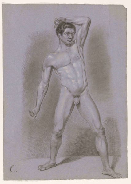 Editor: We are looking at "Standing Male Model," a charcoal drawing made around 1910 by Joakim Skovgaard. It’s a full-length nude figure; the sharp contrasts of light and shadow create a very dramatic effect, especially in the rendering of the musculature. How do you approach a piece like this? Curator: The strength of this work, considered formally, lies in the stark interplay between light and shadow. Note how the artist meticulously models the figure through chiaroscuro, giving tangible form to the subject's anatomy. This deliberate use of value constructs the figure. Editor: I see what you mean; the emphasis is clearly on the shape itself. But what about the expression or mood conveyed? Curator: Observe how the figure holds the simple stick. Is it tensed and straining, or almost floating, like a ballet dancer? Such tensions, these calculated ambiguities of gesture, offer the viewer space for independent assessment of meaning. It’s about form dictating experience, not a prescribed emotional narrative. Editor: So, less about what the model is 'doing' and more about how the shapes and shading create a sense of motion and tension? Curator: Precisely. The success of the piece exists within that interplay, and the objective assessment of elements in concert. A pure viewing experience, divorced from external contextual dependency. The charcoal's texture also serves to enhance this dynamic visual engagement. Editor: That's fascinating; I'm now viewing the drawing completely differently! I focused on what the model represented, but now appreciate that it's the artistry of the gradations, dark against light, that creates the artwork. Curator: Precisely; sometimes, stepping back to observe the formal relationships reveals what truly resonates within a work.