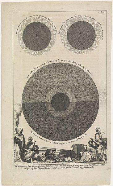 This is an anonymous print from 1705, titled "Koninklijke Almanak van Lodewijk XIV," created with engraving. The visual dominance here is the radiating structure, mimicking the sun's rays, where each line is densely inscribed with text. This design immediately evokes a sense of cosmic order and centralized power. The lines converge on an image of Louis XIV, positioned at the center, suggesting he is the focal point, almost the sun, around which everything else revolves. The structure suggests a symbolic system. The radial lines denote a calendar, each segment representing a period of time, and the text contains astronomical or astrological information. Louis XIV embodies the state, and his power and destiny are intertwined with the cosmos. It merges science, politics, and symbolism into a cohesive representation of royal authority. The overall structure, where text and image work together, invites us to consider how semiotic systems are used to construct and reinforce power structures.