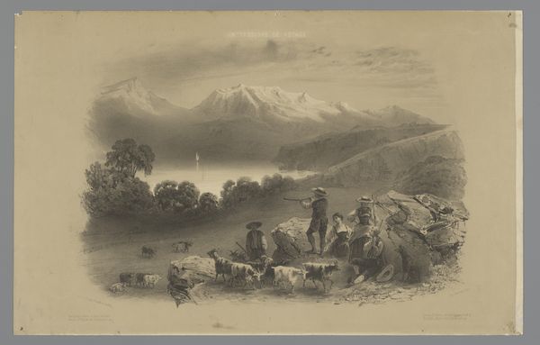 Curator: This captivating drawing, “Islandsk landskab med får og ryttere,” which translates to “Icelandic Landscape with Sheep and Riders,” was created by Oluf Olufsen Bagge around 1821. Bagge captured the rugged beauty of Iceland with simple pencil strokes, now on view at the SMK. Editor: The delicacy is just astounding! The mood is so stark and sort of ethereal, it feels like stumbling upon a half-remembered dream from a Nordic saga. I'm immediately drawn to the way the artist captured the softness in the landscape's harshness using primarily line work. Curator: Precisely. Bagge focuses keenly on rendering form and depth through the strategic use of shading and perspective. The looming mountains in the background give scale to the scene, setting the nomadic scene in stark relief. I find his realism remarkable given the inherent limitations of monochrome media. Editor: It is masterful for sure. The flock of sheep adds an endearing sense of scale; but, at the same time, I sense that the work goes far deeper, it gives a somber meditation on humanity's place within the vast, unyielding theatre of nature. It makes me want to bundle up and find a rocky crag and watch for elves in that strange countryside. Curator: (Laughing) Indeed. The riders too feel small against the sublime presence of the Icelandic terrain. While ostensibly a realistic rendering of Icelandic topography, this piece shows elements of Romanticism evident in its exploration of sublime, wild nature, and smallness of mankind, with pencil economy bringing to mind masters like Caspar David Friedrich. Editor: I’m almost tricked by how restrained the color palette, is, but in an enchanting, almost hypnotic way. It’s funny, isn’t it, how less can sometimes truly be more? Curator: Definitely, in Bagge’s hands the humble pencil becomes a wand. Its lines conduct feelings; its values whisper ancient Icelandic secrets. The artwork reveals something beyond observation. Editor: Well said, It transports me… what more can we expect from art than that?