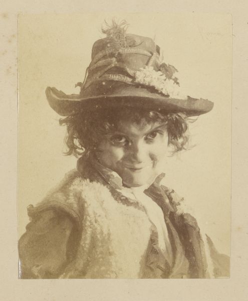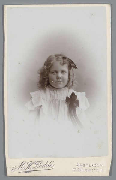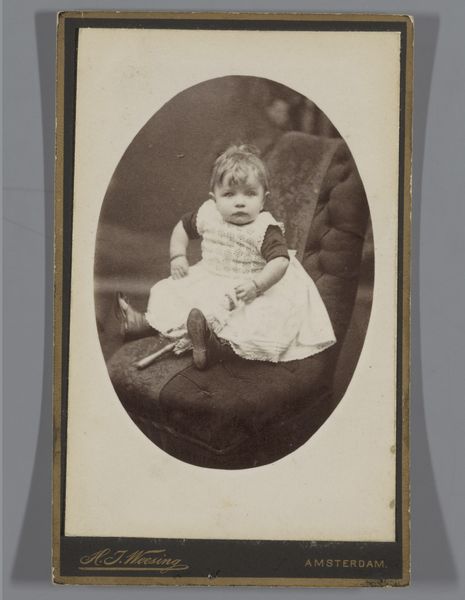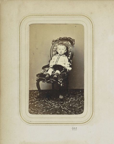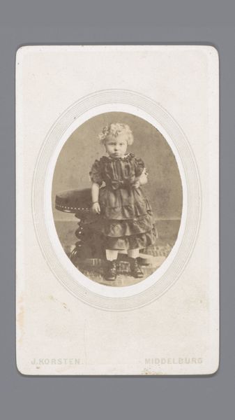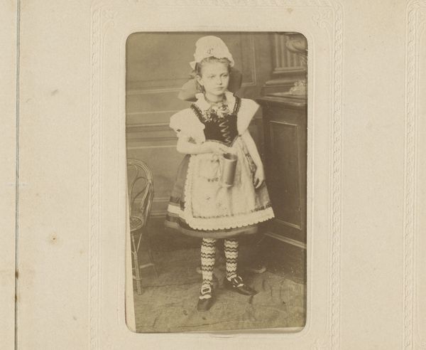 Curator: This gelatin silver print, created in 1886 by E. Vogelsang, is entitled "Portret van een zittend meisje in klederdracht met bal in de hand"—which translates to "Portrait of a seated girl in traditional dress with a ball in her hand." What’s your initial impression? Editor: Nostalgic and slightly melancholic, despite the subject being a young girl. There’s a stillness in her gaze and posture. It's like a frozen moment in time. She’s holding a ball, but seems like she’s waiting instead of about to play. Curator: The style has elements of Romanticism. This reflects the artistic trends of the late 19th century and the interest in the emotional impact of portraits of everyday individuals rather than portraits of powerful men. It romanticized simple village life. It's fascinating how photography contributed to ideas of individual identity. Editor: Right, she’s posed very deliberately. But I also see that playful light catching in her hair! The chair is such a wonderfully ornately carved prop… What statement did photographers intend with these theatrical flourishes? Curator: The chair itself signifies status. The late 19th century was an era of studio photography—a rapidly developing business where a variety of props, backdrops, and costumes would construct staged portraiture for people from many classes, reflecting and shaping social roles and desires. Editor: It's so staged but still strangely touching, no? She is a symbol but a little person. I can practically feel the texture of her lace cap! Her story will always elude us and yet, it makes my imagination run wild! Curator: Agreed. Looking at her attire, the regional clothing emphasizes identity, roots. But it could also reflect an appeal to traditions during a time of fast urbanization and globalization, photography preserving some aspects of old cultures for new consumption. Editor: Maybe that’s why it moves me—the simultaneous reaching for and preserving a sense of place. I wonder if she remembers this day at all? Or the moment of it, frozen and distant and now only half-remembered as it comes back from the past. Curator: That blend of history and emotional resonance certainly makes it a compelling photograph and one of the early successes in a relatively new visual medium at the time. I now notice how that contrasts with modern quick photographs that disappear every day, losing some cultural memory along the way. Editor: Yes, perhaps. Seeing how much went into the images, as the photograph fades, a new emotion seems to enter. That the future is always escaping us.