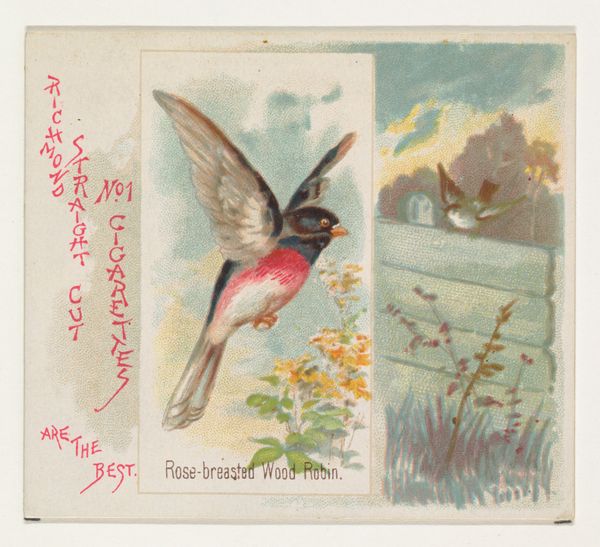 Editor: Here we have "Orchard Oriole," a watercolor and print made around 1890 by Allen & Ginter, as part of their "Song Birds of the World" series for cigarette cards. I’m struck by how delicate and serene it is, almost like a Japanese ukiyo-e print. What do you see in this piece? Curator: It's interesting you mention ukiyo-e. These trade cards often drew from and appropriated other cultural aesthetics to signal "worldliness". But, it's crucial to recognize the colonial context of such appropriations. What does it mean to represent 'exotic' songbirds on products designed to be consumed globally, when so many species were threatened or exploited? How does consumerism intersect with our relationship to the natural world? Editor: So, you’re saying it’s not just a pretty bird, but part of a bigger picture of cultural and environmental impact? Curator: Exactly. This image is embedded within a history of commodification, a system where even nature becomes a marketable object. Who had access to these images? What kind of ideas did they circulate about the world? And, crucially, whose voices were silenced in the process? Editor: I see what you mean. The card seems to flatten the complexity of these birds and their habitats. It almost romanticizes our impact on the world. Curator: Precisely. Consider the implied promise that cigarettes are the best, like these 'best' birds. Do you feel a tension between this commercial claim and its environmental suggestion? Editor: Yes! Now I can't help but wonder if this imagery actually encouraged any awareness or care for these birds, or just further detached people from the natural world. Curator: These objects invite us to think critically about the historical and contemporary power dynamics that shape our understanding of the environment, culture, and consumption. It reminds us to question what values and voices are centered—and decentered—by images like these. Editor: I never thought a cigarette card could hold so much history. Thanks, I learned so much today.