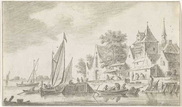 Cornelis Pronk created this river landscape drawing with pen in brown ink around 1720. The composition guides our eyes from the calm waters in the foreground to the distant horizon, all rendered in delicate brown tones that evoke a sense of serenity. Pronk's use of line is particularly striking. Notice how he employs fine, precise lines to define the architecture and the rigging of the sailboats. The texture is rendered through layers of hatching and cross-hatching to suggest depth and form. This technique, typical of Dutch Golden Age drawing, uses a complex semiotic system. The drawing exists not merely as a picturesque scene, but as a structured representation of space and form. Its enduring appeal lies in how Pronk captures a fleeting moment in time through the enduring language of lines and forms. This illustrates the profound interplay between observation, representation, and artistic interpretation.