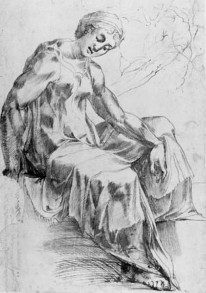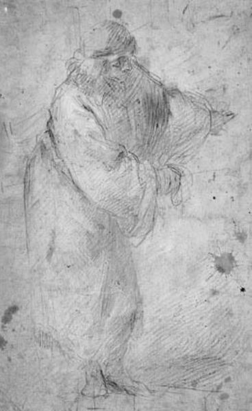 Editor: This drawing is Albrecht Dürer’s “Apostle Bartholomew” from 1523. It’s done in pencil and charcoal and captures Bartholomew holding a book and what looks like a staff. The figure feels so immediate, despite being from the Renaissance. What can you tell me about the context for Dürer creating portraits like this? Curator: Well, we need to consider the function of religious imagery during the Reformation. Dürer lived during a time of immense religious upheaval, with challenges to the Catholic Church’s authority. Prints and drawings, being more affordable and portable than paintings, became vital tools for disseminating ideas. What do you think a drawing of an apostle like Bartholomew might have been trying to achieve in this climate? Editor: Perhaps reaffirming religious figures amidst the turmoil? Showing the unwavering faith, maybe? Curator: Precisely. These images acted as powerful visual statements. Dürer was Lutheran, and while his art often reflected biblical narratives and celebrated Christian ideals, he wasn't simply producing straightforward propaganda. These drawings, circulated through prints, allowed individuals to have a personal connection with religious figures, bypassing the established Church hierarchy. The composition with Bartholomew’s tools becomes a focal point too. Does his prominence shift the public's role from viewer to participant in that era? Editor: I see. So, it's not just about depicting a religious figure, but about empowering individuals through access to these images. I guess art can serve both a spiritual and a political purpose. Curator: Exactly. And Dürer was highly aware of that interplay. Thinking about the context of how Dürer's “Apostle Bartholomew” was distributed sheds light on the social forces driving the art market and imagery politics of the time. It reshaped popular devotion, where people had personal images rather than strictly relying on public-only images. Editor: This really changes my perception of Renaissance art. It's far from static! Thanks for expanding my view on art and history, revealing how art functioned politically and impacted imagery and influence on people. Curator: My pleasure! Seeing art as an active agent of change gives a new dimension.