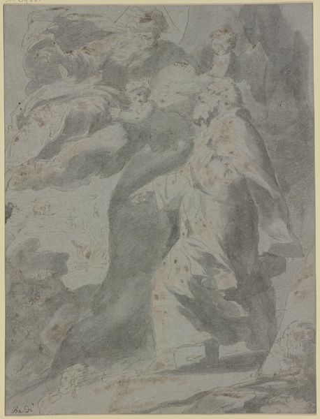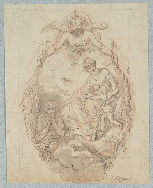 Jerónimo Jacinto Espinosa created this drawing of the Madonna and Child with Angels on Clouds with pen in brown, brush in brown, and grey wash. Notice how the composition is organised within an oval format where the figures are situated on layered clouds, framed by a multitude of cherubic faces. Espinosa skillfully employs wash to create tonal gradations, giving the clouds and figures depth. The line work, though delicate, defines the contours of the Madonna and Child and brings a sense of dynamism to the surrounding angels. The drawing invites us to consider the baroque period's preoccupation with evoking spiritual ecstasy through visual means. The soft tonality and indistinct forms suggest a realm beyond earthly comprehension, challenging the viewer to consider the limits of human perception. The structure offers not just a religious scene, but also an exploration of the sublime, where the boundaries between the physical and metaphysical blur.