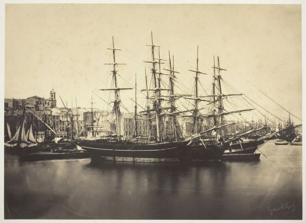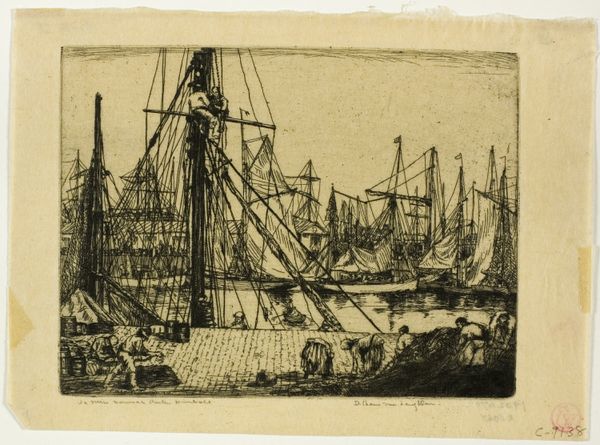 Editor: So, here we have "Auswanderer-Dampfer," or "Emigrant Steamer," created in 1893 by Fritz Stoltenberg, an ink drawing. I’m struck by how detailed and almost photographic it is for an ink drawing, capturing the sheer size of the ship against what appears to be a bustling cityscape. How would you interpret this work? Curator: I see this drawing primarily as a document of production and movement. Consider the date – 1893. This ship isn't just any ship; it’s an *Auswanderer-Dampfer*, a vessel specifically built to transport people. Who were these people? Where were they going? What kind of labor produced this vessel and supported its journeys? These are important questions about consumption, mobility, and material circumstances embedded in this image. Editor: That’s fascinating, the title suddenly brings in layers I hadn’t considered. So it's less about the aesthetic qualities, and more about the labor and lives connected to this…object? Curator: Exactly! The “Realism” of the style almost functions like reportage here. It's about the ship as a tool, a product of shipbuilding labor, and simultaneously, a means of transporting laborers – emigrants – often away from their own means of production. Where does the material reality of the ship intersect with these displaced lives? Think about the material traces left on the ship with each journey, or its role within the larger maritime economy. Editor: I see, the drawing prompts us to consider the socio-economic reality behind this rather ordinary scene of a ship in dock. It's powerful to think of the artist documenting the very beginning of someone's huge life change and linking it to manufacture and distribution. Curator: Indeed, it makes us consider the physical objects used in these moments. It brings questions of economic shifts to the surface and the materiality that affects these individuals. Editor: Thank you. It completely changes how I view the artwork when you examine it through the lens of material and labor!