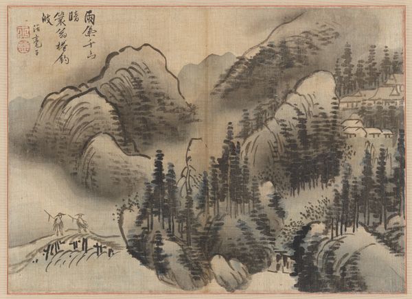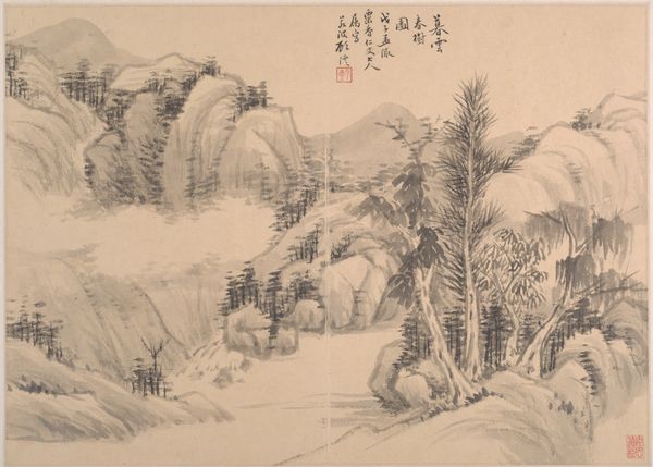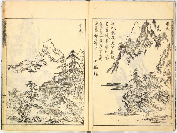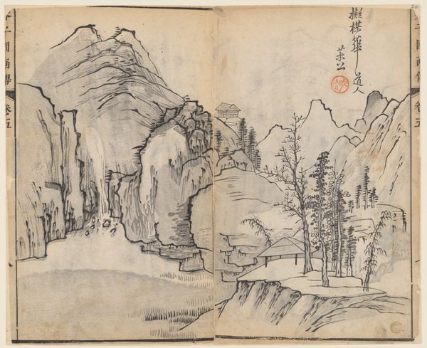 Editor: We are looking at a page from *The Mustard Seed Garden Painting Manual*, crafted around 1679, and attributed to Wang Gai. It's a woodblock print featuring ink, residing at the Metropolitan Museum of Art. I find it incredibly delicate. The composition with layered shapes creates depth. What are your first impressions? Curator: The print exemplifies a formal engagement with traditional landscape painting. Note the strategic use of the void. How does the negative space contribute to the overall structure, in your opinion? Editor: I see how the varying ink densities around the mountains gives them an ethereal quality and really pushes them back. And because they aren’t fully described it kind of separates foreground from background? Curator: Precisely. The gradations are crucial. Let us also consider the compositional arrangement. We see a progression from the foreground elements, such as the meticulously rendered rocks and figures, to the more abstracted mountains in the background. Can you describe how line functions in the construction of form here? Editor: I see crisp, dark lines defining the trees and figures, contrasted with softer, blended lines suggesting the distant mountains. Curator: Indeed. These variations create both depth and a sense of atmosphere. Notice, too, the repetition of forms; the rounded shapes of the rocks echo those of the mountains, creating a visual rhythm. What effect do you think the artist intended with this structural choice? Editor: I think they might suggest the interconnectedness and harmony within nature. Curator: Yes. This structural mirroring promotes a balanced composition and underscores an aesthetic pursuit. Paying attention to internal formal relationships opens up the work. Editor: It really does. Thanks for pointing that out! I now view its balance and form so differently.