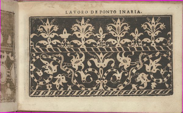 Curator: Looking at this image, what jumps out to you? Editor: The contrast. It’s so stark, all black and white, really emphasizes the patterns. Like looking at a detailed blueprint almost. Curator: Indeed. What we’re seeing here is a page from "Teatro delle Nobili et Virtuose Donne...", dated 1616, from the hand of Isabella Catanea Parasole. The Metropolitan Museum of Art houses this particular drawing and print. Editor: Parasole… interesting. The work feels less like ‘high art’ and more like a manual or instructional guide. Those repeating motifs clearly have a function beyond pure decoration. What medium did she work in? Curator: Primarily line engraving and drawing it seems. Consider its context: printed pattern books gained popularity around this period, facilitating the spread of designs to wider audiences. Editor: Right, so it’s less about individual expression and more about democratizing craft skills, allowing people access to intricate designs regardless of social class. Who was using this, specifically? Was it for the professional artisans or… Curator: More for the noblewomen, perhaps of middling means, eager to showcase refinement through handiwork. Creating a visual culture to signify status and accomplishment. Think how lace making, needlework, became intertwined with female education and identity at the time. Editor: So the material reality—the needle, thread, fabric—connects directly to broader social expectations and the labor involved in domestic 'virtue.’ Curator: Precisely. And note the title – theater – hinting at performative aspect, these domestic skills playing part in women's role in public perception. Editor: Interesting, almost proto-feminist take here by offering work that also serves and reflects. Curator: An insightful view on its place in time and lasting reflection of society, isn't it? Editor: Indeed. Food for thought concerning gendered craft then and its evolution now.