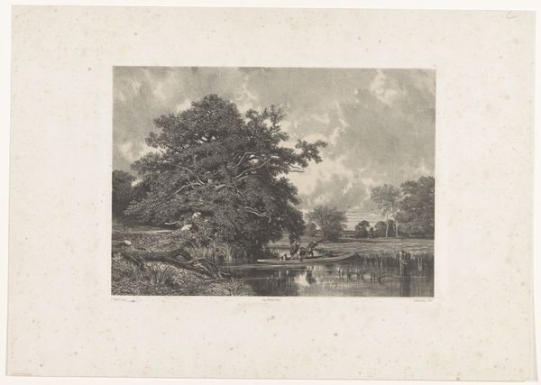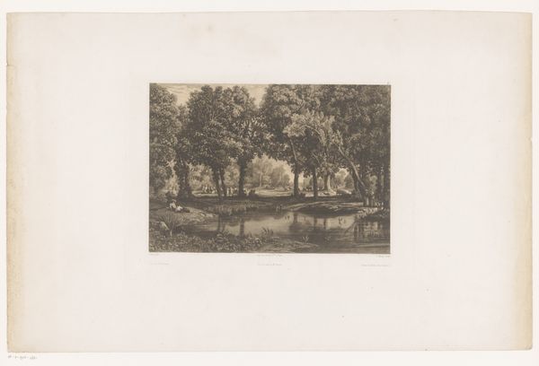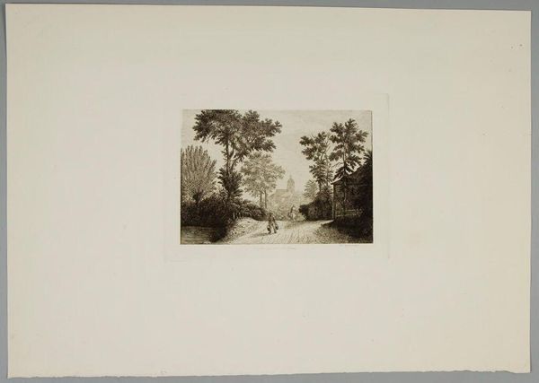Editor: This is Maxime Lalanne's "On the Outskirts of Paris," a landscape etching. It feels like a fleeting moment, a peaceful escape. What symbols do you see embedded in this image? Curator: Notice how the trees frame the distant figure, almost like a stage? The lone figure could symbolize humanity's relationship with nature, a search for solace. How does that resonate with you? Editor: I see the search for solace, definitely. There's something timeless about the scene. Curator: The river, the path – these are ancient symbols of journey, of life's passage. Lalanne subtly invites us to reflect on our own place within this enduring landscape. Editor: I hadn't thought about the river as a symbol that way. Thank you! Curator: It’s a reminder of nature's constant presence, even as cities grow. Hopefully it helped you see the image with new eyes.